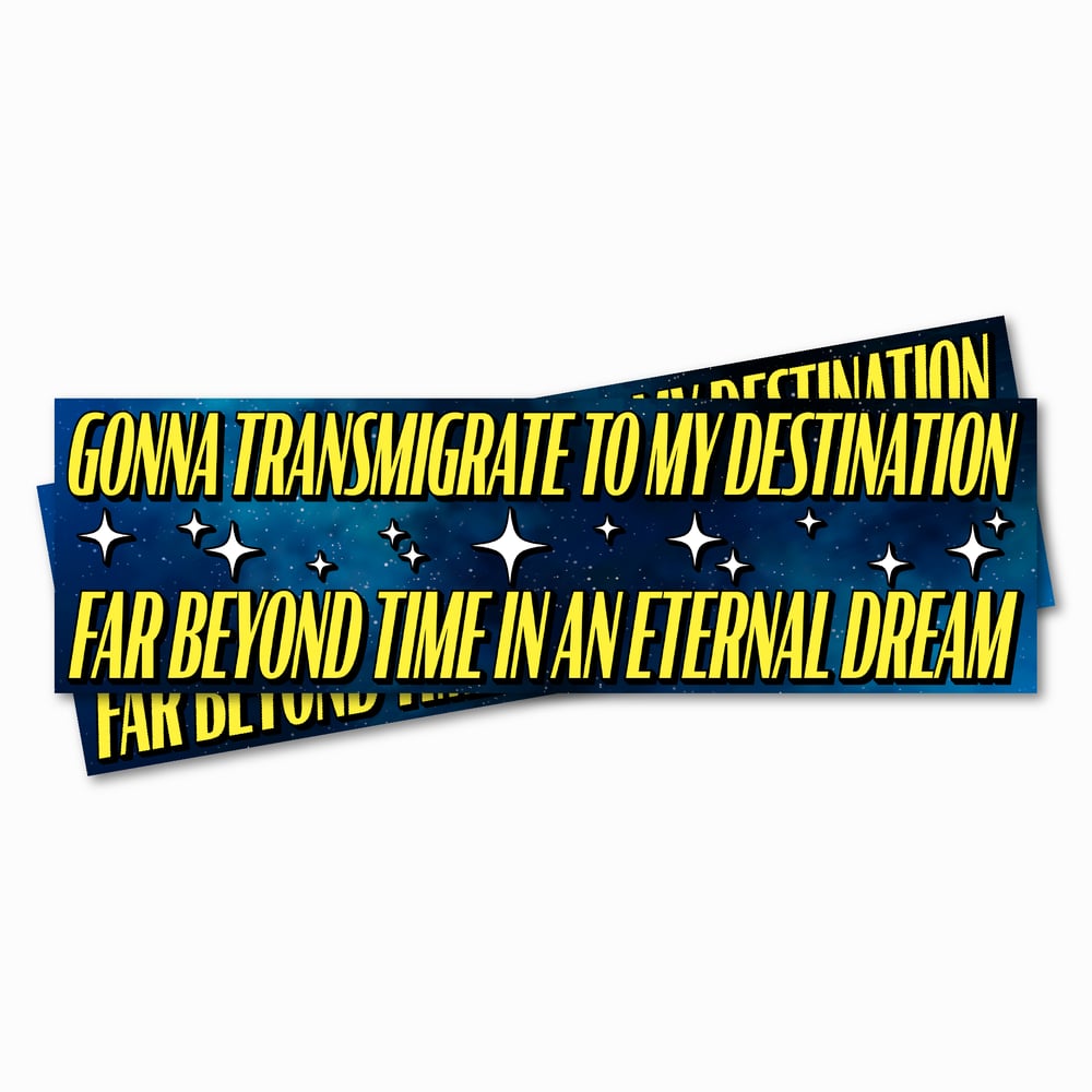 Two 10" x 3" glossy vinyl bumper stickers with UV-resistant top coat and split backing.